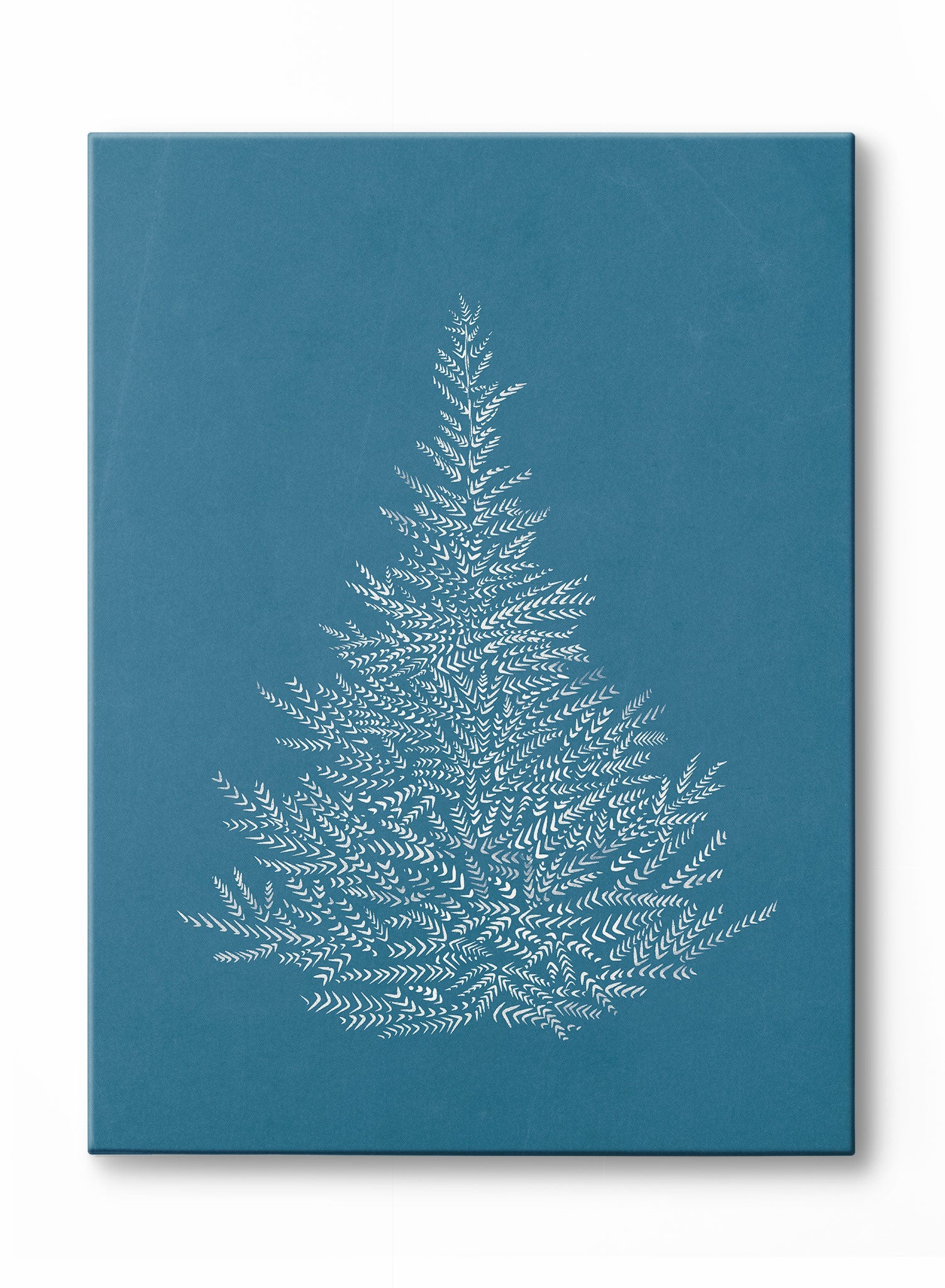 This elegant image features the outline of a white pine tree, delicately drawn against a rich blue backdrop. The fine, feathery branches of the tree are meticulously detailed, creating a sense of lightness and grace. The deep blue background evokes a crisp winter day, with the white tree standing starkly against it, as though it were freshly dusted with snow.