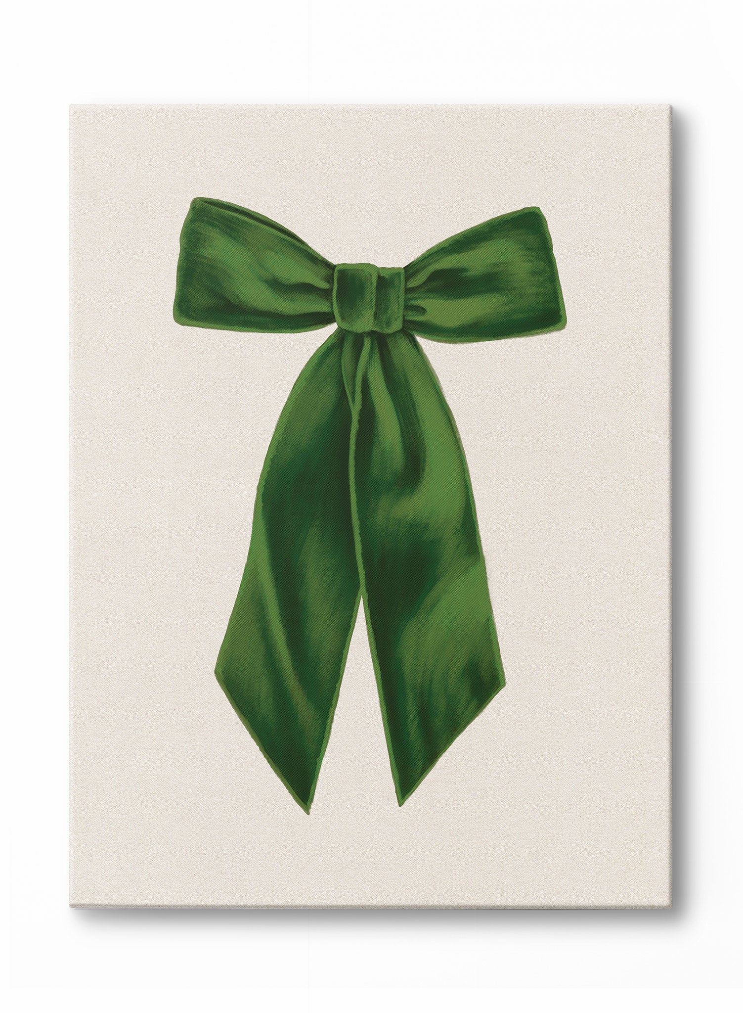 This image presents a lush green bow, rendered in smooth, soft strokes that give it a realistic, almost tangible quality. The carefully tied ribbon, with its long trailing ends, adds a sense of elegance, while the vibrant green color brings to mind traditional holiday decorations. The folds and shadows within the bow create depth, as if it could be plucked right off the canvas.