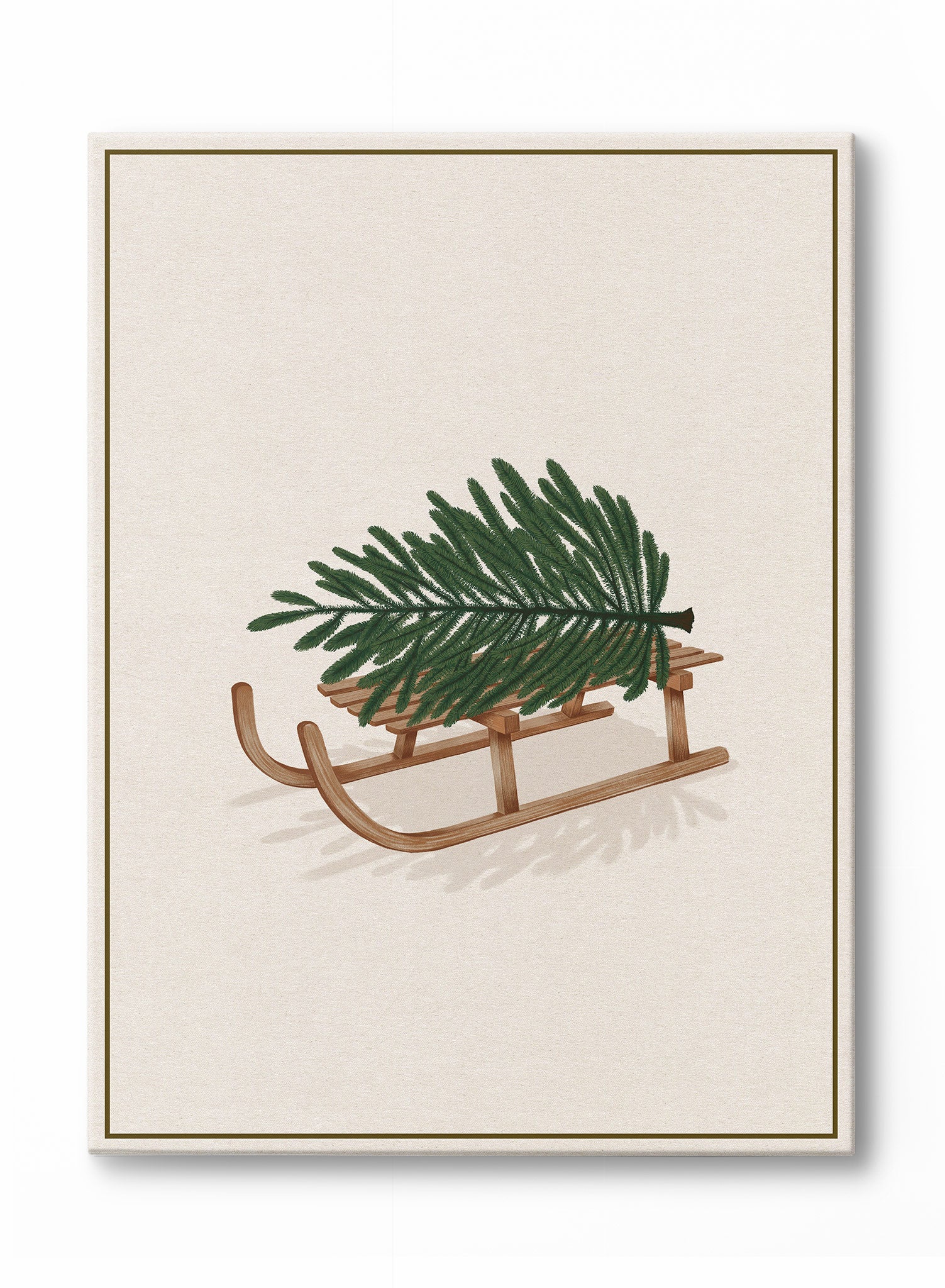 In this artwork, a simple wooden sled carries a fresh green pine branch, set against a cream-colored background. The sled, crafted in a traditional style with curved runners and wooden slats, is rendered in warm, earthy tones that contrast beautifully with the vibrant green of the pine branch. The composition is minimal yet full of seasonal charm, evoking the feeling of a winter’s day spent gathering evergreens.